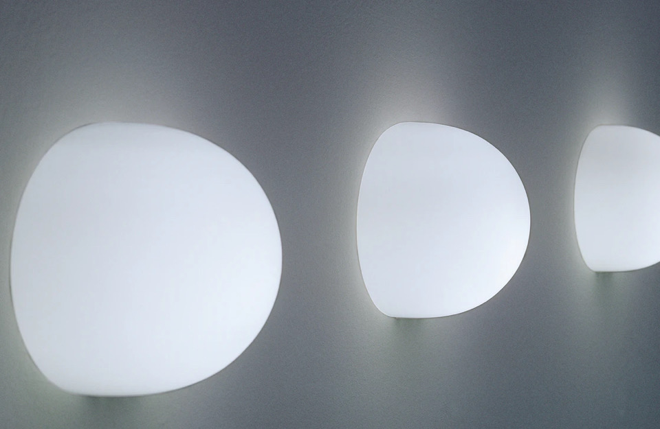 壁挂式灯提供漫射光。扩散器由外部酸蚀刻、手工吹制、闪烁的不透明玻璃组成。镀锌压制钢墙配件。