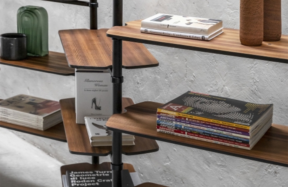 Levante是一个哑光黑色金属的模块化书柜,有天花板或墙壁固定。货架有饰面可供选择:石板、热处理落叶松、哑光黑色金属。这是一个非常通用的书柜,允许为房子的各个房间进行多种配置,从起居区到家庭办公室。