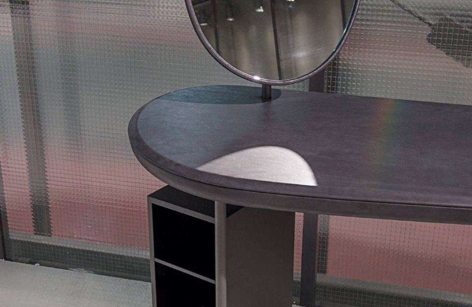 写字台/梳妆台,带或不带镜子,带整体式顶部由 MDF 漆亚光黑色斜面顶部或包覆皮革、镜面玻璃或大理石(白色 Carrara、黑色Marquinia 和红色 Levanto);大理石版本提供缎面饰面和不透明的透明保护清漆或哑光或光泽
